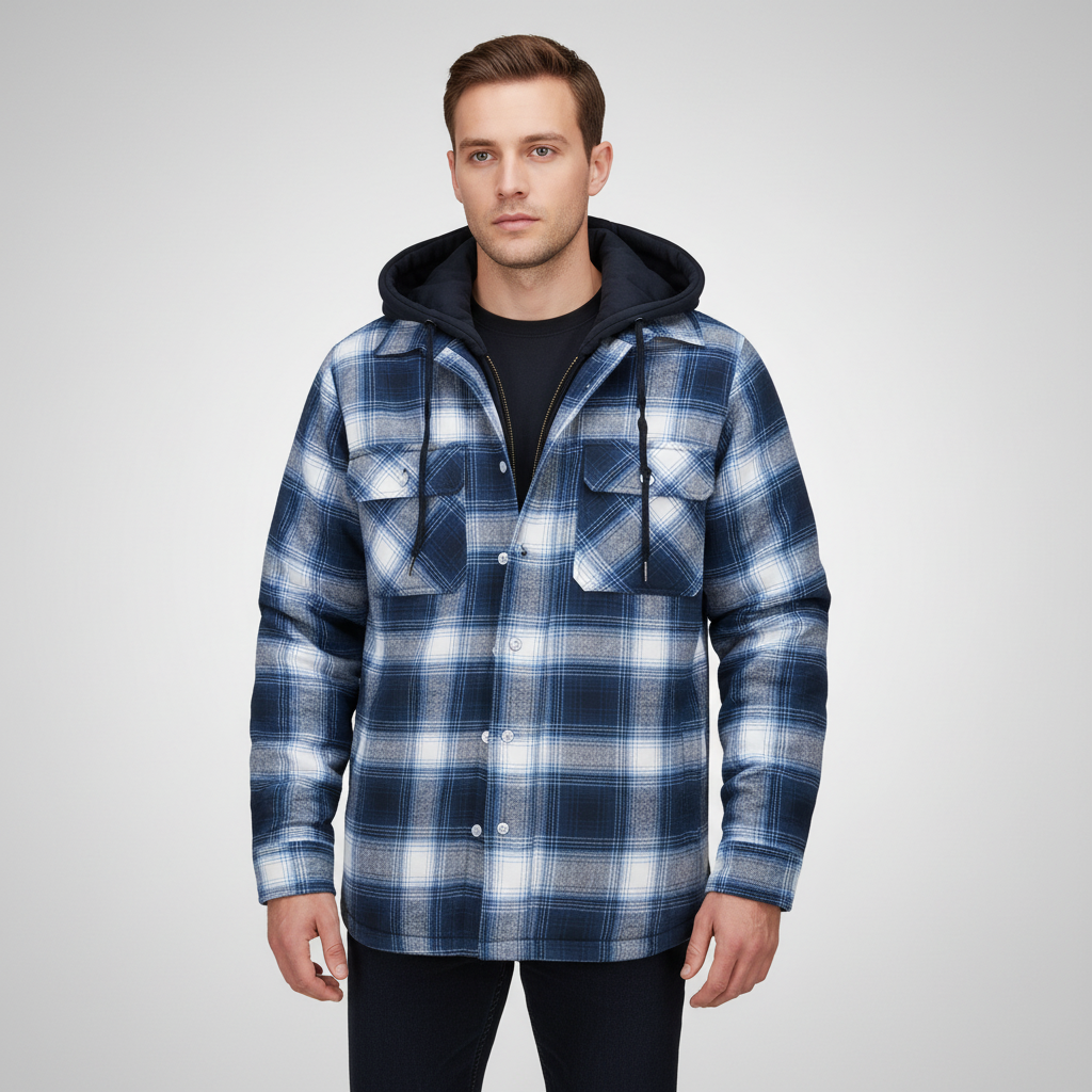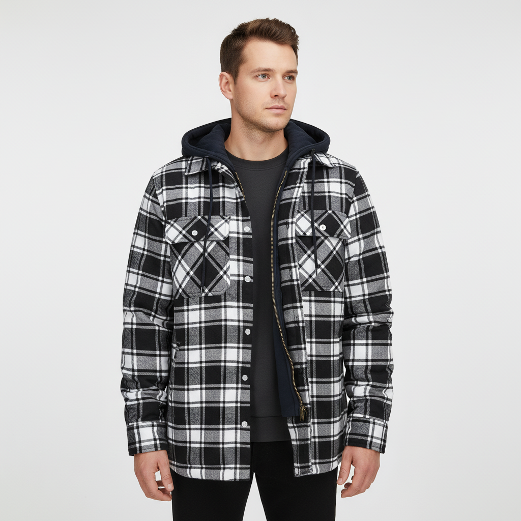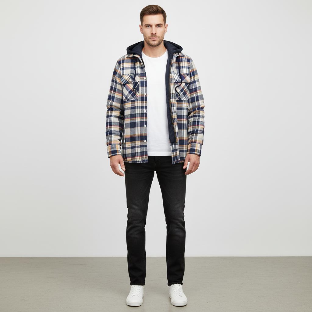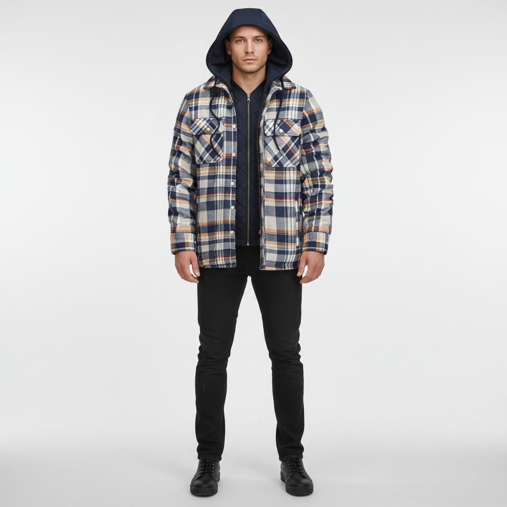 Finding a jacket that is both stylish and functional can be challenging. This model offers warm lining and a cool checked design, perfect for cooler days. With a practical hood and functional pockets, it is the ideal companion for everyday life or special occasions. Whether you're out for a walk or taking the train, you'll arrive warm and well-dressed.