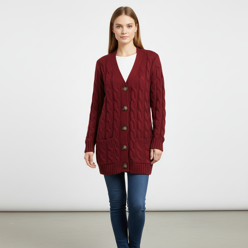 It can be challenging to find a suitable piece of clothing that is both stylish and comfortable. This jacket combines both with its soft, breathable fabric and the stylish cable pattern. Whether worn over a blouse or a T-shirt, it always provides the necessary warmth and adds a special charm to your appearance. With practical pockets and an elegant button placket, it is also suitable for everyday wear.